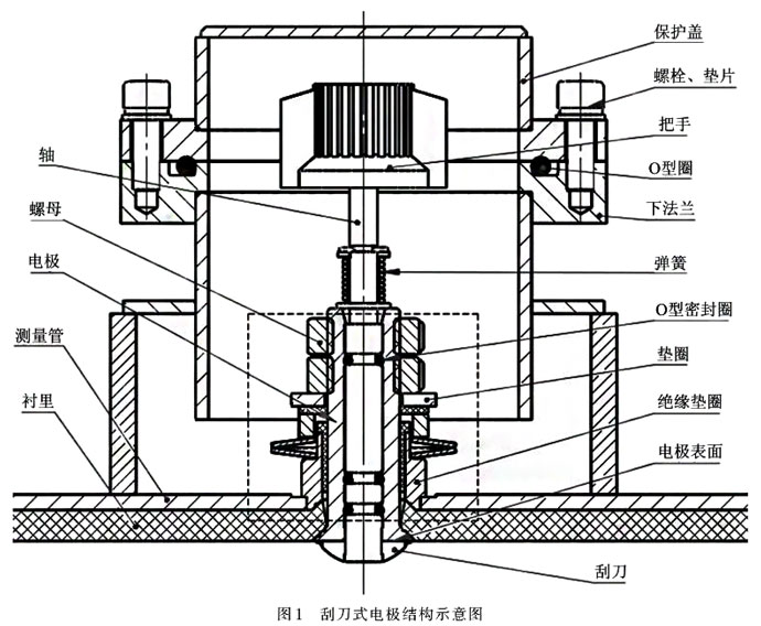 為了解決電磁流量計介質(zhì)結(jié)垢的問題,目前傳統(tǒng)做法都是采用刮刀式機械清理的方法來解決。刮刀式電極的結(jié)構(gòu)示意圖如圖1