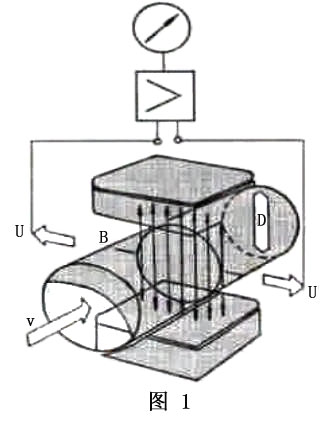 如圖1所示,在一內(nèi)徑為D,內(nèi)部磁場強度為B的非導磁性測量管內(nèi),液態(tài)的具有導電性被測介質(zhì)以v的速度流動,則在與流動方向垂直的方向上產(chǎn)生與流量成比例的感應(yīng)電勢U,該電勢的大小如下