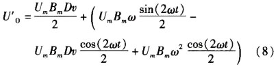 由式(8)可以看出信號(hào)經(jīng)過信號(hào)處理之后得到U'0,交流部分[UmBmω*sin(2ωt)/2]-[UmBmDv*cos(2ωt)]+[UmBm ω ² cos(2ωt)/2]可經(jīng)過低通濾波器濾除,直流部分UmBm Dv/2經(jīng)過放大后直接輸人MCU進(jìn)行處理轉(zhuǎn)換成流量信號(hào)顯示出來。