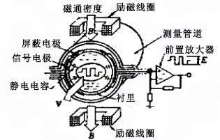 無電極式電磁流量計原理如圖所示。當導電性液流過與流動方向垂直的磁場(測量管道)時,根據(jù)法拉第電磁感應定律,就會產(chǎn)生與平均流速成正比的感應電動勢E。這一電動勢用一對信號電極檢測,該電極放置在(不接觸流體,稱無電極)與流動方向及磁場方向垂直的測量管村里外壁上測得們流量信號經(jīng)轉換放大后,即作為流體的體積流量這個電動勢用下式表示,即與平均流速成正比: