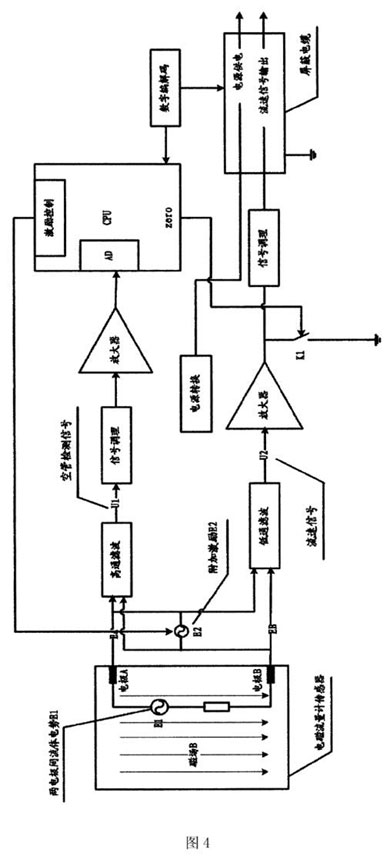 圖1是一種原有電磁流量計的電路結(jié)構(gòu)示意圖圖2是一種原有帶空管檢測的電磁流量計的電路結(jié)構(gòu)示意圖圖3是一個電極與地之間施加空管檢測信號的電磁流量計的電路結(jié)構(gòu)示意圖圖4是兩個電極之間施加空管檢測信號的電磁流量計的電路結(jié)構(gòu)示意圖五、具體實施方式見圖1示意圖中,電磁流量計傳感器在交流勵磁下,產(chǎn)生交變磁場,導(dǎo)電流體在交變磁場中切割磁力線產(chǎn)生感應(yīng)電勢E1,通過屏蔽電纜輸出至遠端信號轉(zhuǎn)換器的主控制電路板,在主控制電路板上輸出流速信號并顯示見圖3、圖A示意圖中,由CPU控制口產(chǎn)生周期為16us的高頻激勵,經(jīng)模擬轉(zhuǎn)換為高頻正弦激勵E2,該i正弦激勵直接施加在,電磁流量計傳感器的其中一個電極與地或者是兩個電極之間,(圖3是一個電極與地之間施加空管檢測信號的電磁流量計的電路結(jié)構(gòu)圖,圖4是兩個電極之間施加空管檢測信號的電磁流量計的電路結(jié)構(gòu)圖):由此產(chǎn)生被測流體內(nèi)阻R1的測量信號U1,該測量信號U1與流體內(nèi)阻R1成線性關(guān)系U1=K*R1(K為已知系數(shù)),不可避免的是流體內(nèi)阻測量信號與流體流速測量信號同時存在,二者混在一起,再經(jīng)過高通濾波電路將空管檢測信號提取出來,此時對流速信號衰減在604B以上,經(jīng)CP實時采樣并經(jīng)過數(shù)字濾波后,與設(shè)定的閱值(可調(diào)參數(shù))相比較,若判斷為空管,則v發(fā)出zcro信號,立刻閉合開關(guān)K1關(guān)閉流速測量信號,使信號轉(zhuǎn)換器顯示為零,否則斷開開關(guān)K正常輸出流速信號。而電極上流速測量信號經(jīng)過低通濾波電路,此時對空管檢測信號衰減60u8以上,再經(jīng)過信號調(diào)理電路后輸出流速信號,實現(xiàn)與空管檢測信號相互分離,從而保證流速測量的準(zhǔn)確度008]見圖2示意圖中,是一種原有的帶空管檢測的電磁流量計的電路結(jié)構(gòu)圖,由于電纜分布電容的影響,該分布電容對高頻率的空管檢測信號有一定的損耗,特別是長距離的屏蔽電纜,會直接影響到空管檢測信號對于流體電導(dǎo)率的測試,所以該結(jié)構(gòu)并不適合,本實用新型提出的高頻率信號空管檢測方式。結(jié)合圖3和圖4可以看出為了保證微弱的空管檢測信號不失真的傳輸,空管檢測裝置就近放置于傳感器出線處(傳感器內(nèi)部),進行信號處理后再通過屏蔽電纜傳輸,從而解決了高頻率空管檢測信號對電纜分布電容大小的要求009由于電磁流量計傳感器與信號傳換器之間通常只有用于傳輸流速信號的二芯屏數(shù)電纜,并沒有低壓直流電源供給電纜,為了滿足通用的安裝習(xí)慣,不對空管檢測裝置另外增加供電電纜,空管檢測裝置的供電電源使用二芯屏蔽電纜的其中一根導(dǎo)線進行供電,另外一根導(dǎo)線用于傳輸經(jīng)過調(diào)理后的流速信號;實現(xiàn)直流供電與信號傳輸共用一根二芯屏蔽電纜0020根據(jù)不同的使用環(huán)境,信號傳換器需要調(diào)整空管檢測裝置的空管閱值參數(shù)設(shè)置時,則使用數(shù)字信號調(diào)制方式,該信號疊加在供電電源的電纜上進行傳輸,方便在現(xiàn)場調(diào)整空管檢測裝置的參數(shù),滿足不同的使用條件。由于數(shù)字編解碼是已知的技術(shù),所以在這里不詳細(xì)進行說明