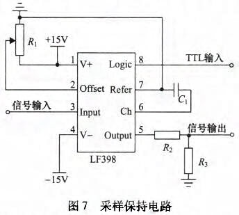 采樣保持電路實際是一種模擬信號存儲器,其開關(guān)通斷通過數(shù)字指令控制,從而完成輸入信號瞬時值的采樣及存儲。圖7所示為集成芯片LF398組成的采樣保持電路,該電路具有采樣速度快、保持下降速度慢、抗干擾能力強和不易受溫度影響等特點,其邏輯電平輸人與TI相連。當TTL為高電平時,對輸入信號進行采樣;當TIL為低電平時,對輸入信號進行保持。
