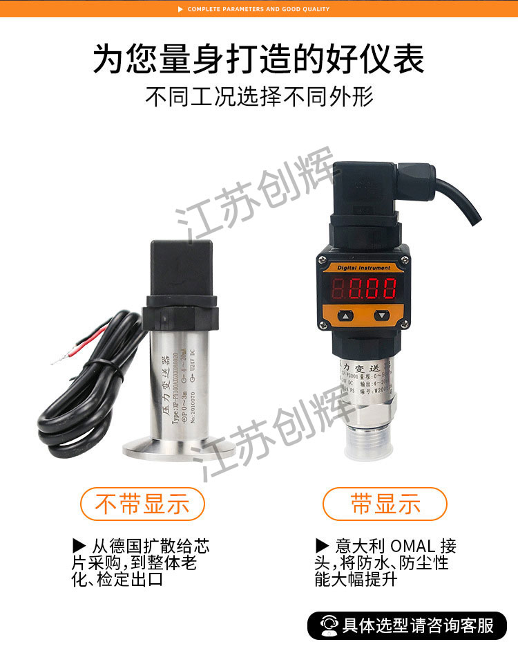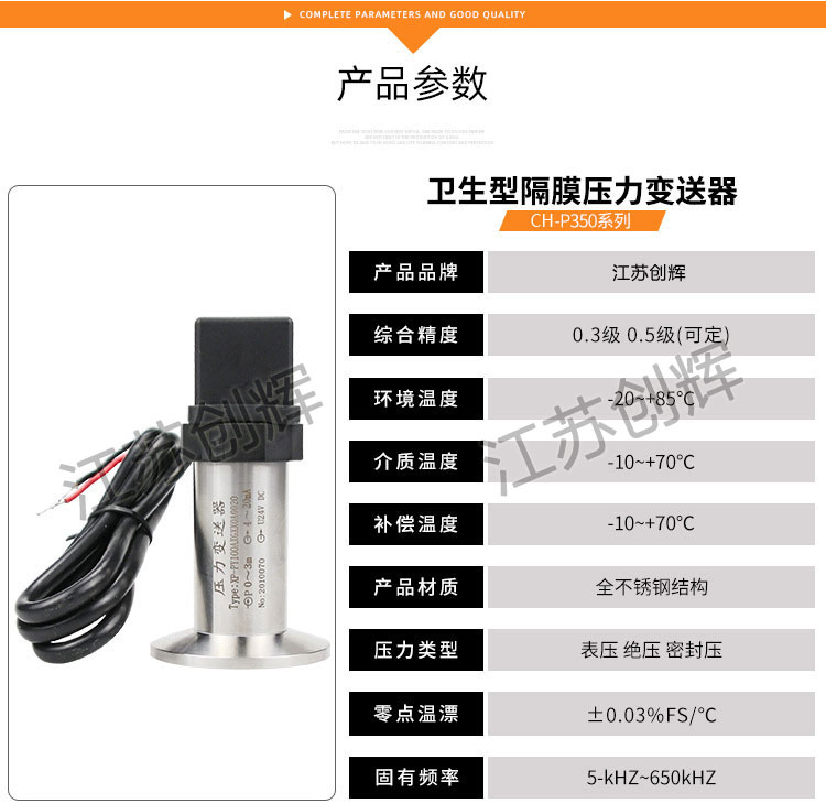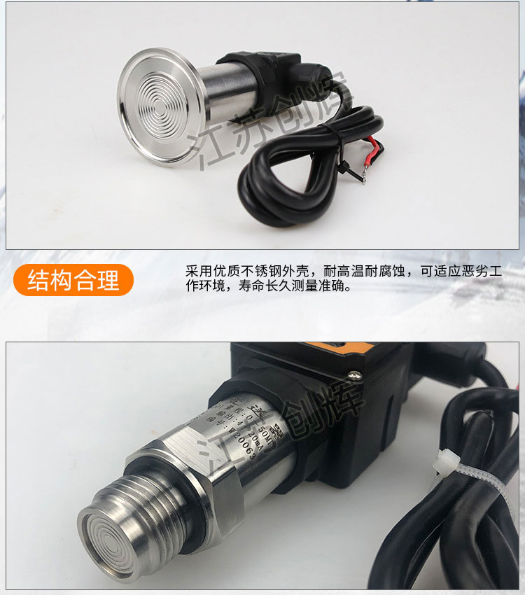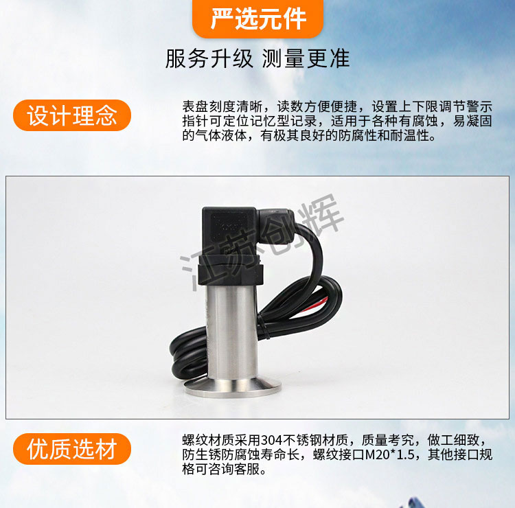 CH-2088W衛生隔膜壓力變送器是專門為醫藥、啤酒、奶倉等醫藥食品領域設計的專用型產品,該系列采用E+H**技術,其設計完全遵照醫藥食品行業的衛生級標準。利用齊平大波紋片使測量介質與壓力傳感器相隔離,其間灌充衛生及專用油,可保證在介質溫度150℃的高溫下無溫漂的穩定工作。客服了目前工業現場上常用齊平式擴散硅或陶瓷電容變送器因傳感器直接接觸介質,從而在高溫情況下溫漂大,導致超差,尤尤其是滅菌環境節時變送器極容易損壞的弊病。