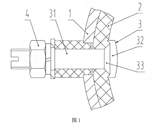 電磁流量計是利用法拉第的電磁感應定律,即導電性液體在垂直于磁場的非磁性測量導電性液體在垂直于磁場的非磁性測量管內流動,與流動方向垂直的方向上會產生與流量成比例的感應電勢,我們根據感應電動勢的大小就可以知道流過的流量大小。電磁流量計電極的作用是從測量管中引出感應電動勢,而測量的介質可以是帶腐蝕性的各種液體,因此電極的密封和絕緣是非常重要的。參見圖4、圖5,現有的電磁流量計電極的安裝結構是這樣的:其包括金屬外管1、襯里2和電極3,襯里2設置在金屬外管1中,金屬外管的管壁設有用于電極3穿過的過孔,襯里2上設有與金屬外管上的過孔同心的裝配圓孔,電極3包括電極桿31和位于電極桿一端的電極圓頭32,電極桿31和電極圓頭32成型為體,電極桿31穿過襯里的裝配圓孔和金屬外管的過孔,電極圓頭32與襯里2內壁相接觸形成密封面。