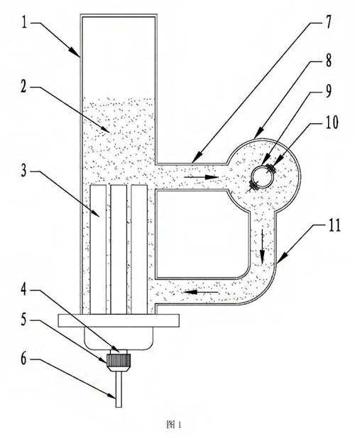 圖1為本發明電磁流量計脫蠟裝置結構示意圖;圖中序號說明:1箱體、2導熱介質、3PTC陶瓷加熱器、4防爆接線座、5鎖緊帽、6電纜、7*介質通道、8吸熱器、9測量導管、10電極、11第二介質通道。