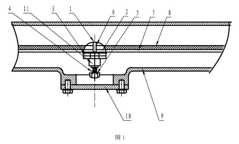 圖1所示,可拆卸電極的電磁流量計由外殼9及安裝于外殼內的測量管7、及電極組件組成,在測量管內側安裝有測量管襯里8,以隔絕測量介質和測量管的接觸。在外殼9上設有凸臺,所述凸臺上開有中心孔,并通過緊固螺栓固定有壓蓋10。電極組件由電極軸以及安裝于電極軸上的電極頭1、電極座6和絕緣電極座套2組成,在所述電極軸的外端部設置有旋鈕5,所述電極軸上螺接有壓緊螺母3和絕緣座套11,在絕緣座套11與所述旋鈕之間的電極軸上套接有彈簧4,以增加電極頭1的穩固性。本實用新型不僅方便拆卸,而且正常使用時,電極頭也能很牢固地定位,可有效滿足測量需求。